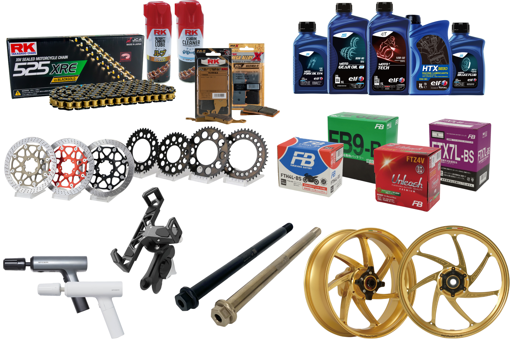 ドライブチェーンやエンジンオイルをはじめとしたバイク足回り全般のパーツ類、